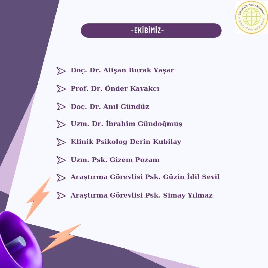 Terapi Bilimleri Akademisi Laboratuvarı, Prof. Dr. Önder Kavakcı, Doç. Dr. Alişan Burak Yaşar, Doç. Dr. Anıl Gündüz, Uzm. Dr. İbrahim Gündoğmuş ve Klinik Psikolog Derin Kubilay’ın danışmanlığında, çeşitli psikoterapi yöntemleri alanında çalışmalar/araştırmalar yapmaktadır. Ekibimize katılacak ve vizyonumuzu gerçekleştirmemize yardımcı olacak proje ekip üyeleri arıyoruz.