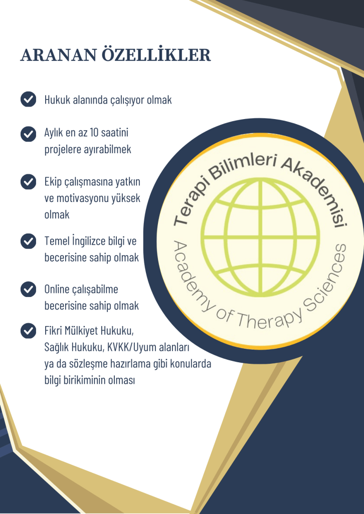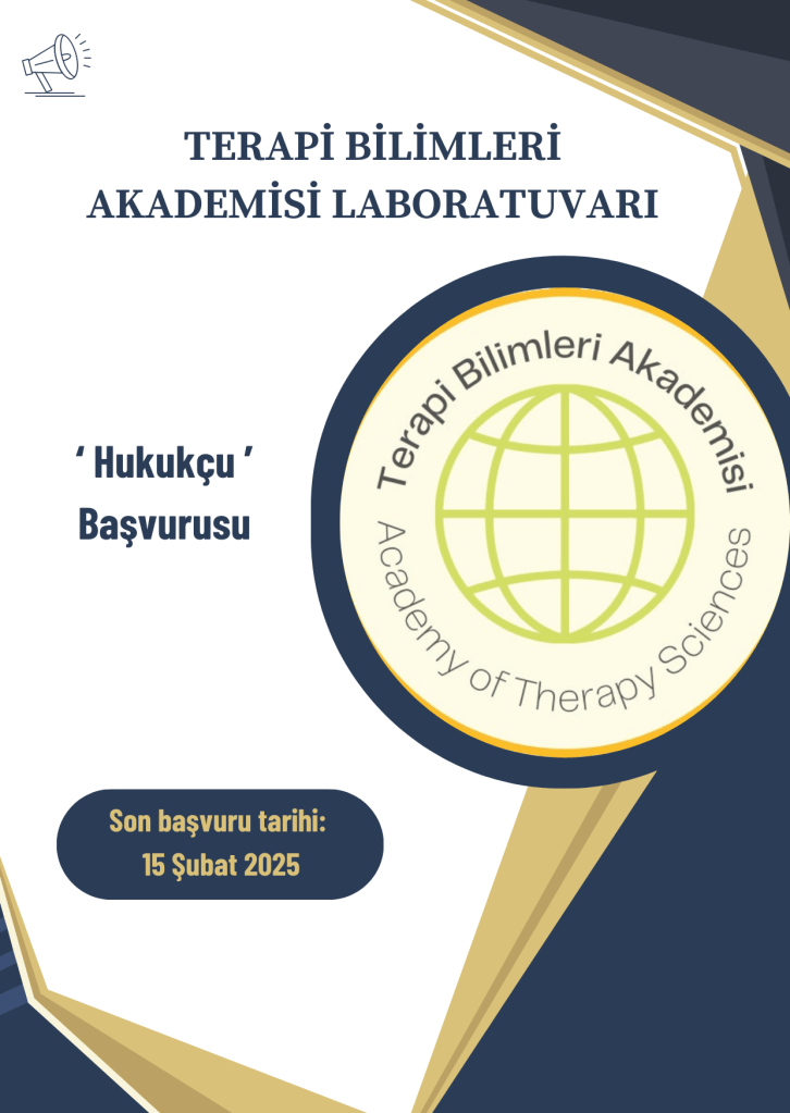Terapi Bilimleri Akademisi Laboratuvarı, Prof. Dr. Önder Kavakcı, Doç. Dr. Alişan Burak Yaşar ve Klinik Psikolog Derin Kubilay tarafından kurulmuş olup; Doç. Dr. Anıl Gündüz, Uzm. Dr. İbrahim Gündoğmuş, Prof. Dr. Fatih Yavuz ve alanında uzman pek çok değerli akademisyenin rehberliğinde, çeşitli psikoterapi yöntemleri ve bilimsel araştırmalar üzerinde çalışmaktadır. Bu minvalde, Hukuk lisans mezunu olan, yüksek lisansına devam eden veya hukukçu olarak çalışan; ekibimize katılarak vizyonumuzu gerçekleştirmemize yardımcı olacak Hukukçular arıyoruz.